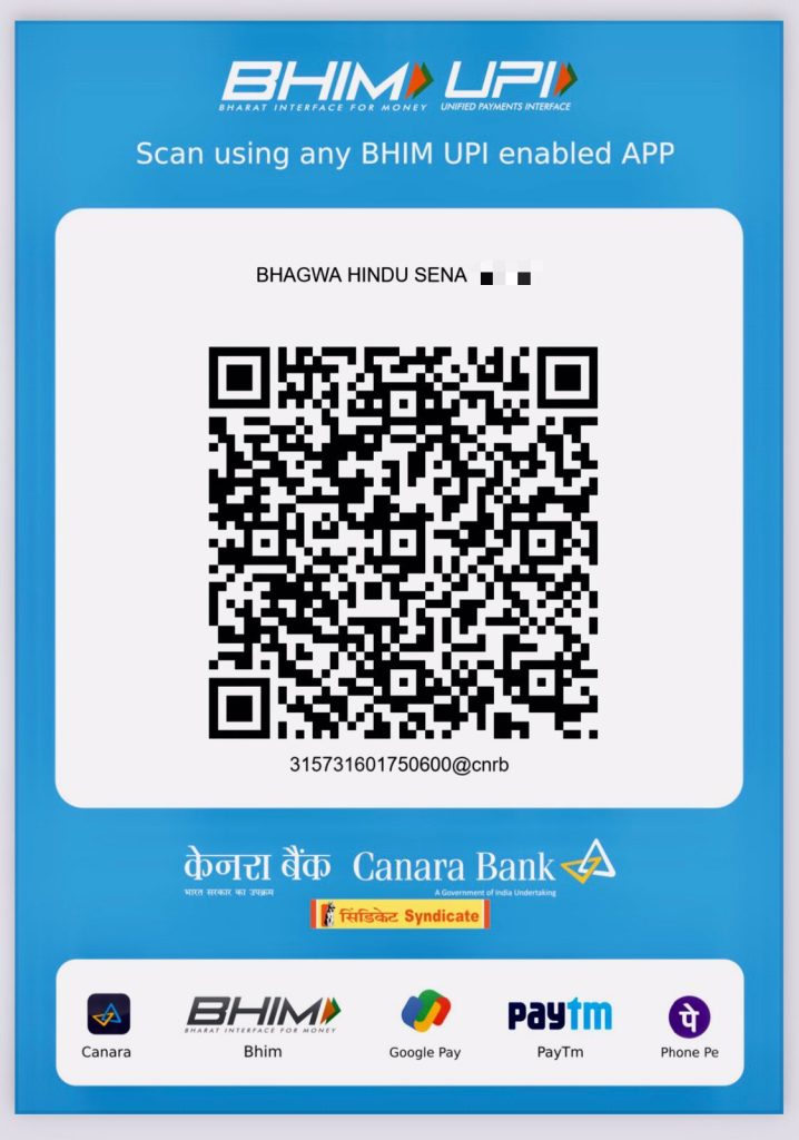 Donation Page Bank Account Details Account Name: Bhagwa Hindu Sena Account Number: 120002750600 IFSC Code: CNRB0019321 Give Donation to Bhagwa Hindu Sena We appreciate your support! Kindly make a donation via NEFT or any available method. Your contributions help us carry out our mission effectively.