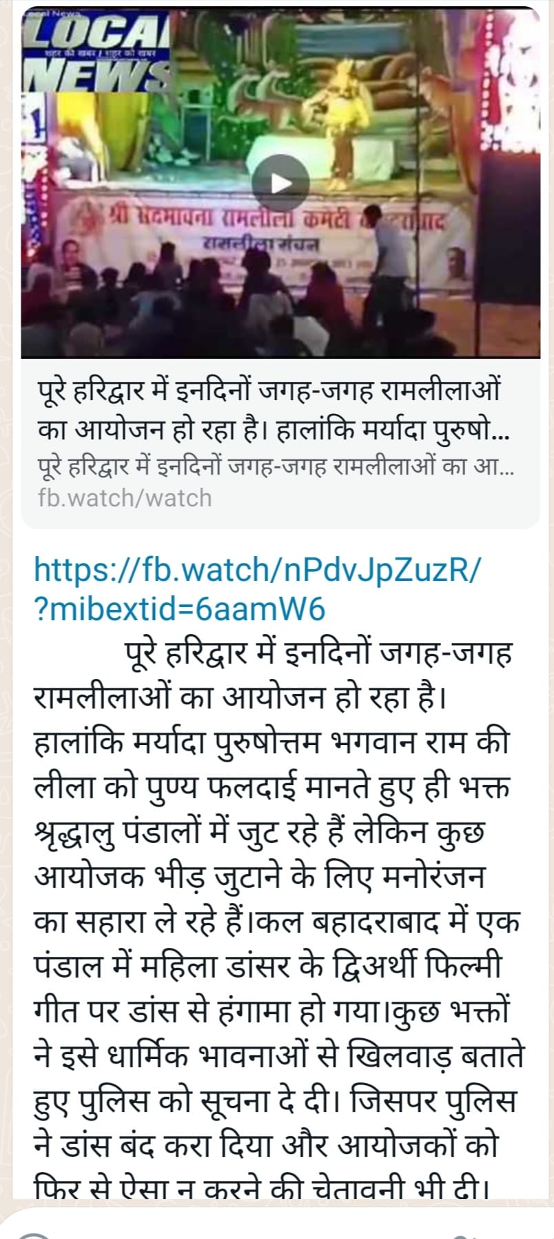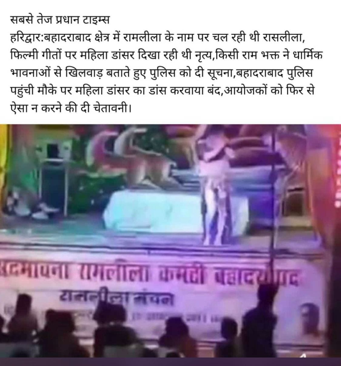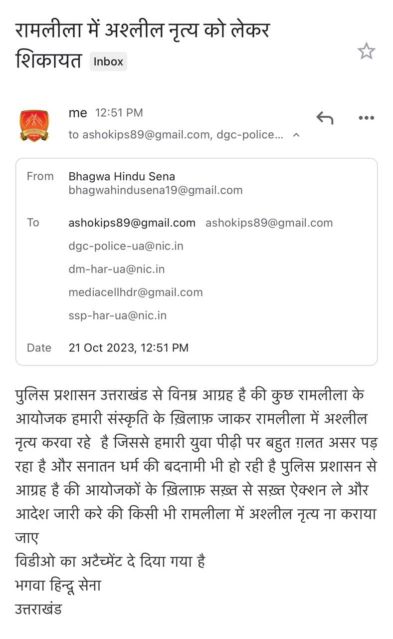 अक्टूबर 2023: उत्तराखंड में रामलीला में हो रहे अश्लील नृत्य के खिलाफ आवाज उठाई गई और उसे रुकवाया गया।