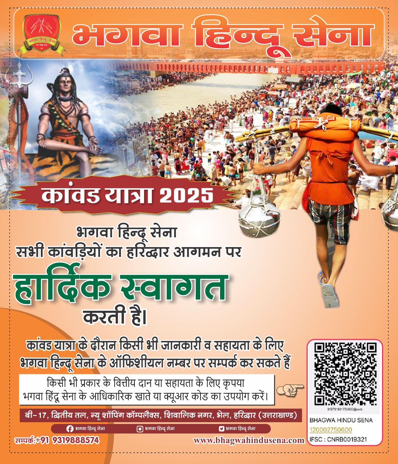 जुलाई 2025: भगवा हिन्दू सेना, हरिद्वार, उत्तराखंड द्वारा कांवड़ यात्रा 2025 में सभी शिवभक्तों का स्वागत किया गया और प्रसाद वितरण भी किया गया।